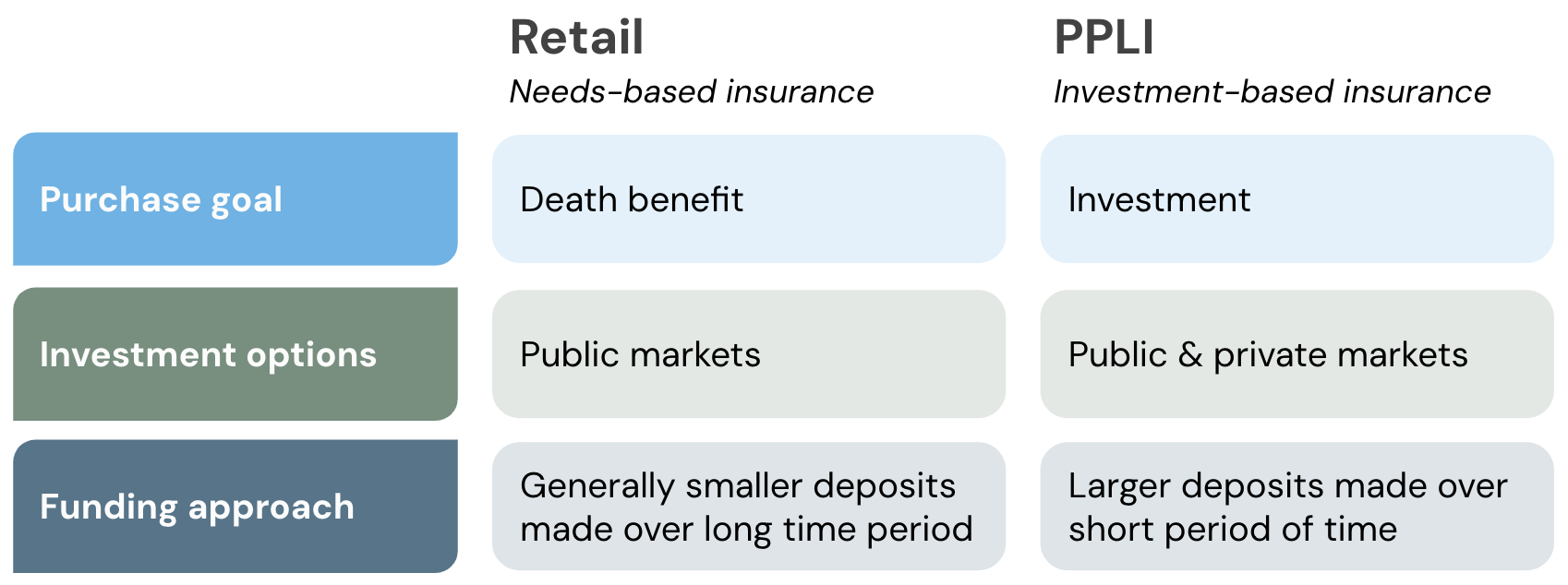 Additionally, PPLI's advantage over retail life insurance is its lower, transparent, institutional pricing. Whereas retail insurance products such as whole life and universal life have higher costs and may lack transparency, PPLI is priced and structured like an investment. Fees and costs are clearly listed, and, unlike most retail insurance products, PPLI policies generally do not carry surrender charges or penalties.
